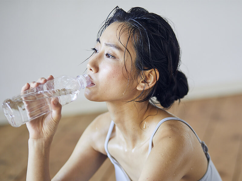 ホットヨガのレッスン中はインストラクターが水分補給を促してくれますが、のどが渇いたら指示がないときでも我慢せずに水分を補給することが大事です。常温の水や白湯だと内臓が温まり、排せつがスムーズになる効果も期待できますよ。