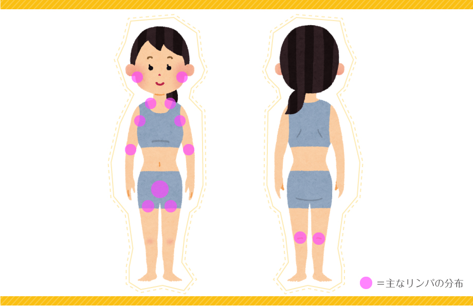 首の付け根、脇のした周辺、足の付け根から内腿にかけてあります。