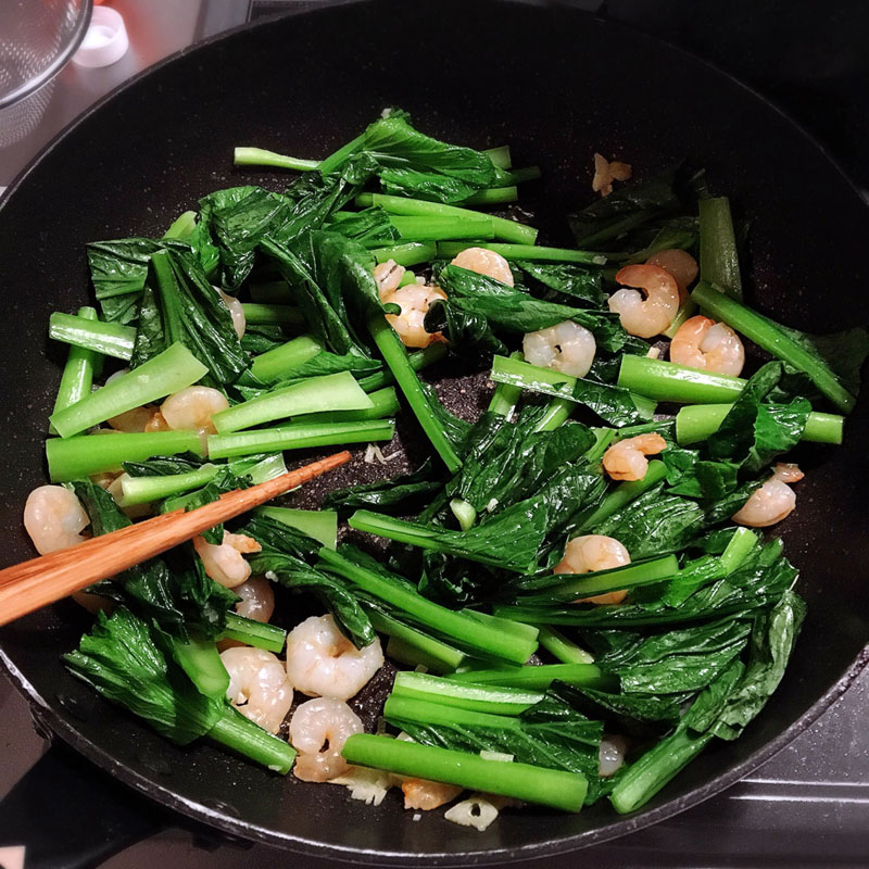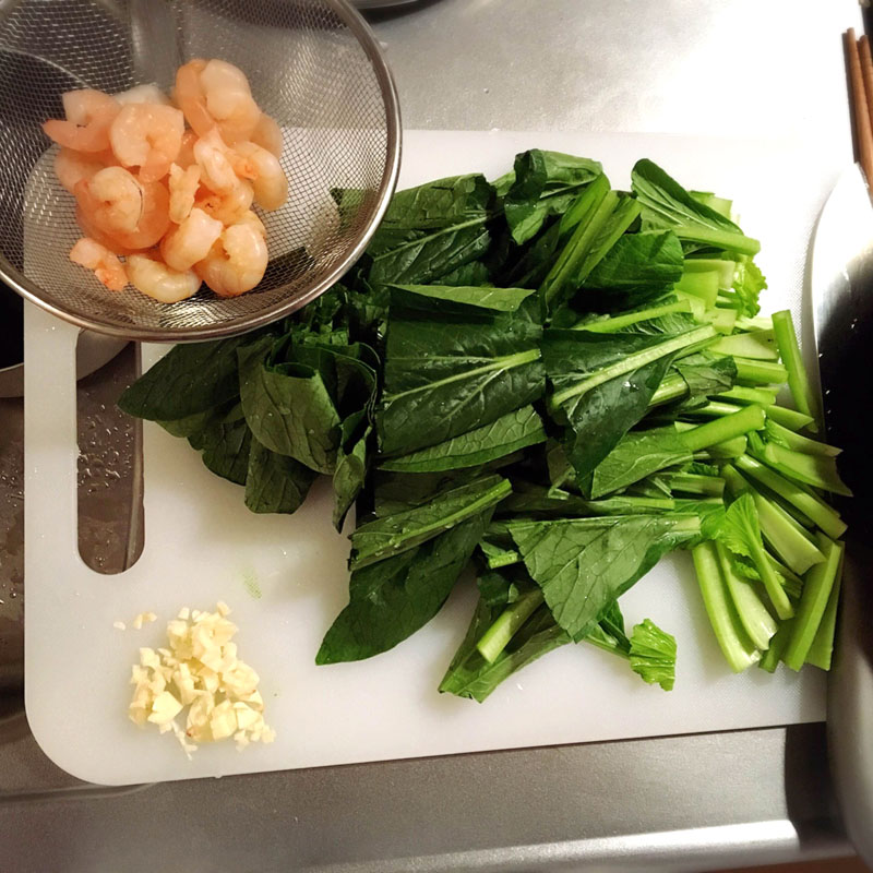 (3)深めのフライパンにオリーブオイルをいれ、にんにく、エビ、小松菜の順に炒める。