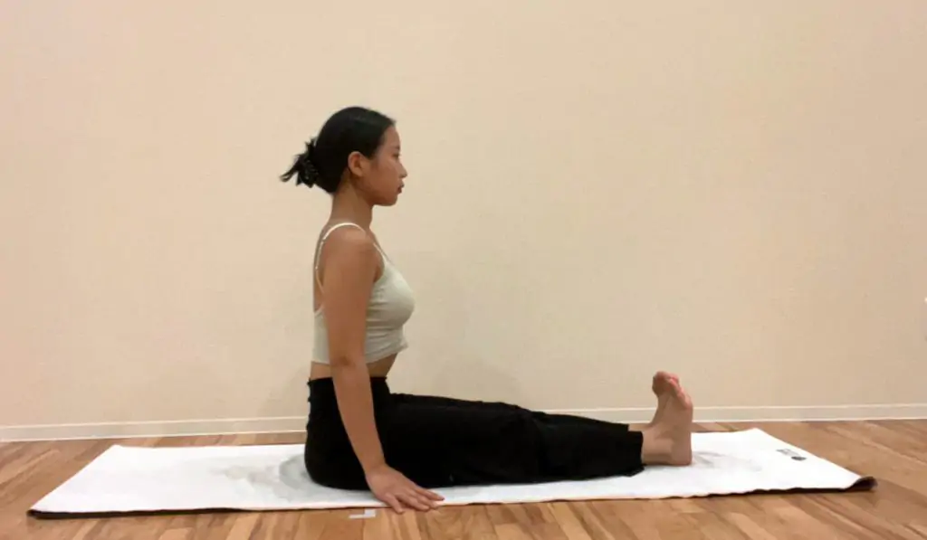 1.マットの上に足を伸ばして座る。2つの坐骨でしっかりと座り、背骨まっすぐに伸ばす。