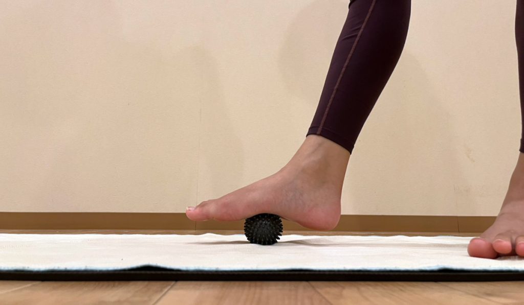 「立ち上がった状態で足の裏をコロコロ転がして刺激する。寝転がり、お尻の硬い場所やふくらはぎもボールを転がしながらほぐす」
