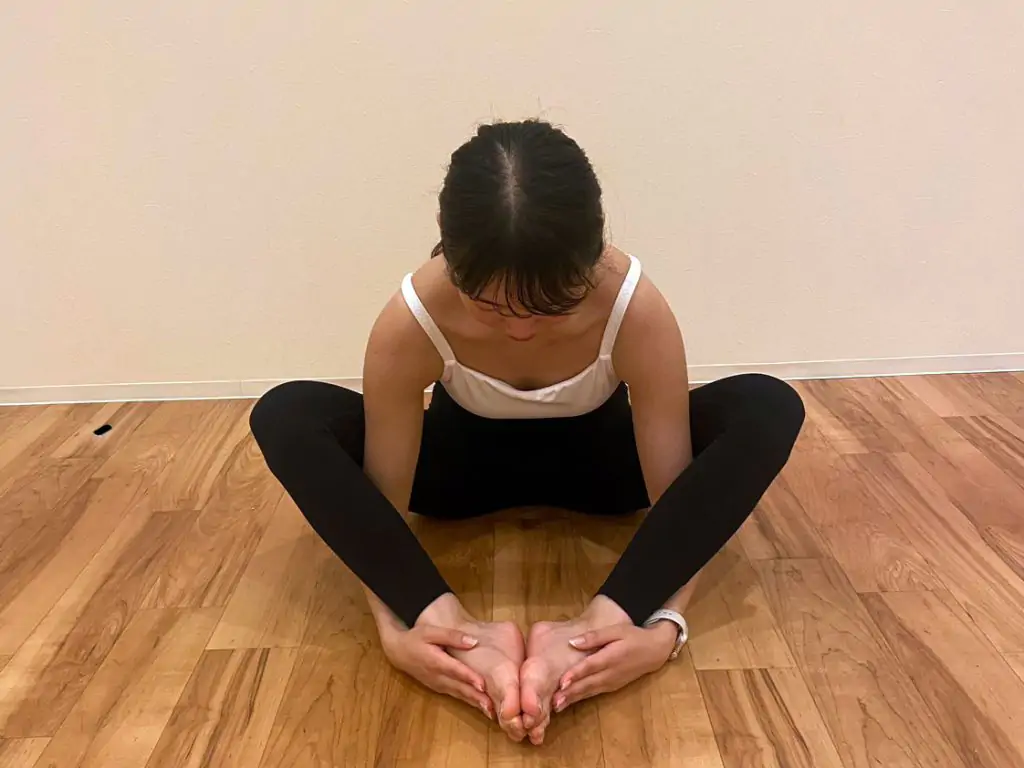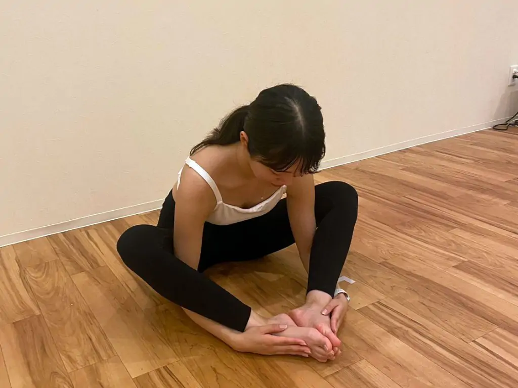 - 両足の裏同士を合わせて股関節を開きます。(この時点できついと感じる方は足を少し前にずらしてかかとを遠ざけておきましょう。)