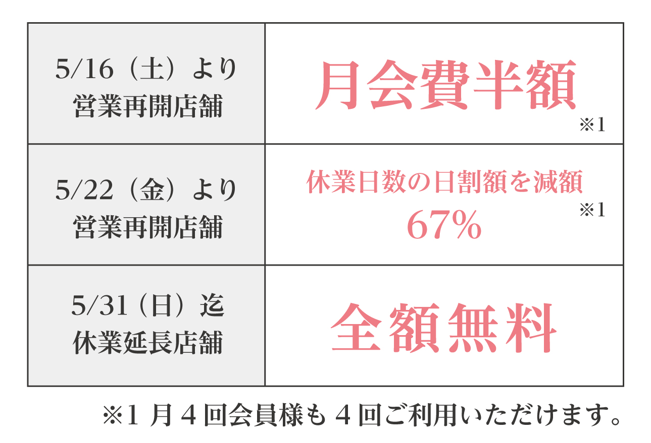 5月度の月会費については、休業期間に合わせて下記とさせていただきます。