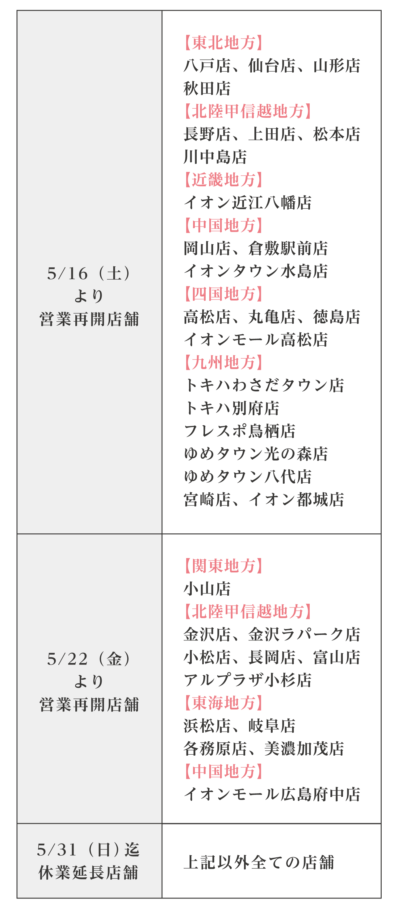 ※6/2(火)以降の営業再開に関しましては、各自治体の休業要請・入居施設の営業方針に従い決定させていただき、5/31(日)21時頃発表させていただきます。