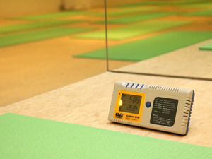 スタジオ内は、電気サウナストーブを使ってあたためています。ガスや灯油のように燃焼に酸素を必要としないので安全性が高く、空気もきれい。ロイブではCO2測定器を使い、換気管理も徹底しています。