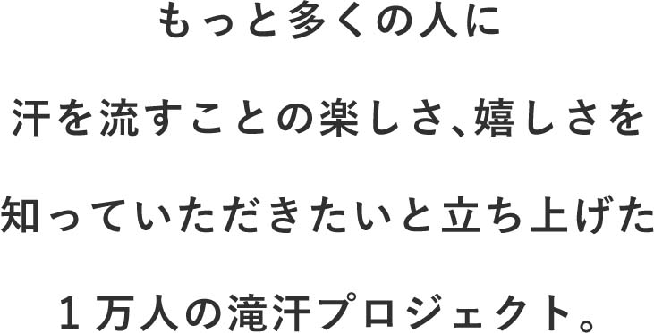 ホットヨガスタジオロイブでは1号店オープンから10年以上、たっぷり汗が流れる事にこだわり、スタジオの環境やレッスンプログラムを研究し続けてまいりました。そして、こんな時代だからこそ自分に向き合いながら心を燃やして汗を流す気持ちよさを、1万人の女性に体験していただく事を目標に掲げ、このプロジェクトを立ち上げました。