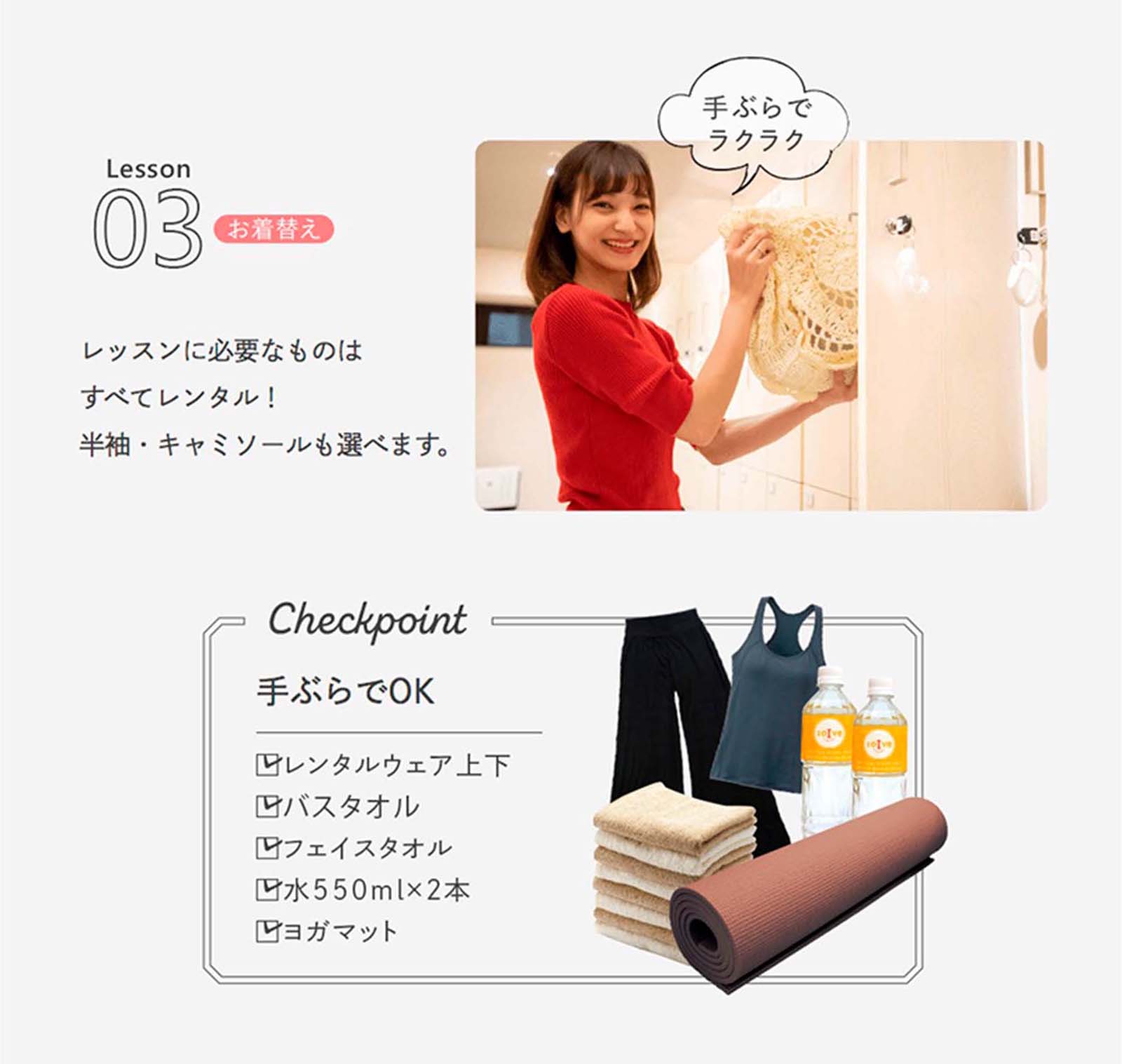 ウェアも、お水も、ヨガマットも、タオルも、ぜ~んぶご用意。手ぶらで体験していただけます。