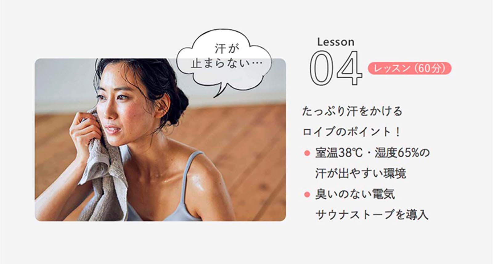 ロイブでは、もっとも汗が出る理想的な環境づくりに力を入れています。常に室温38℃湿度65%を保ち、カラダの芯からポカポカあたためる電気サウナストーブを使用。ラクに呼吸しながら驚くほどの汗をかき、カラダを柔軟にするスタジオです。 大量の発汗で新陳代謝がアップして効果的に脂肪燃焼。お客さまに心身のデトックスや爽快感を体感していただきながら、求める効果を最大限に引き出します。さぁ、あなたも滝汗を実感してみよう