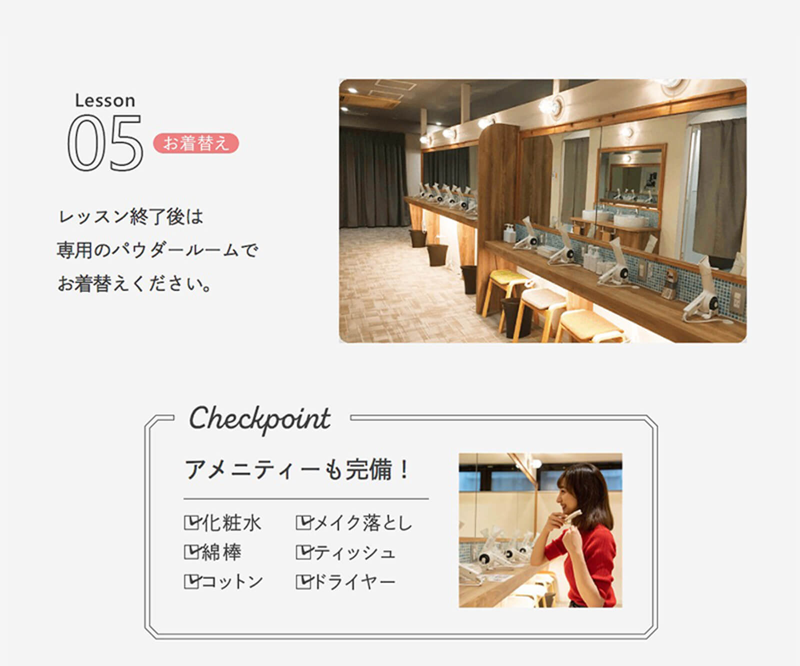 スタジオ内は汗をかきやすい環境となっておりますので、シャワー後の替えの下着とバスタオルをご用意いただくことをおすすめいたします。※キャンペーン内容により持ち物は異なります。
