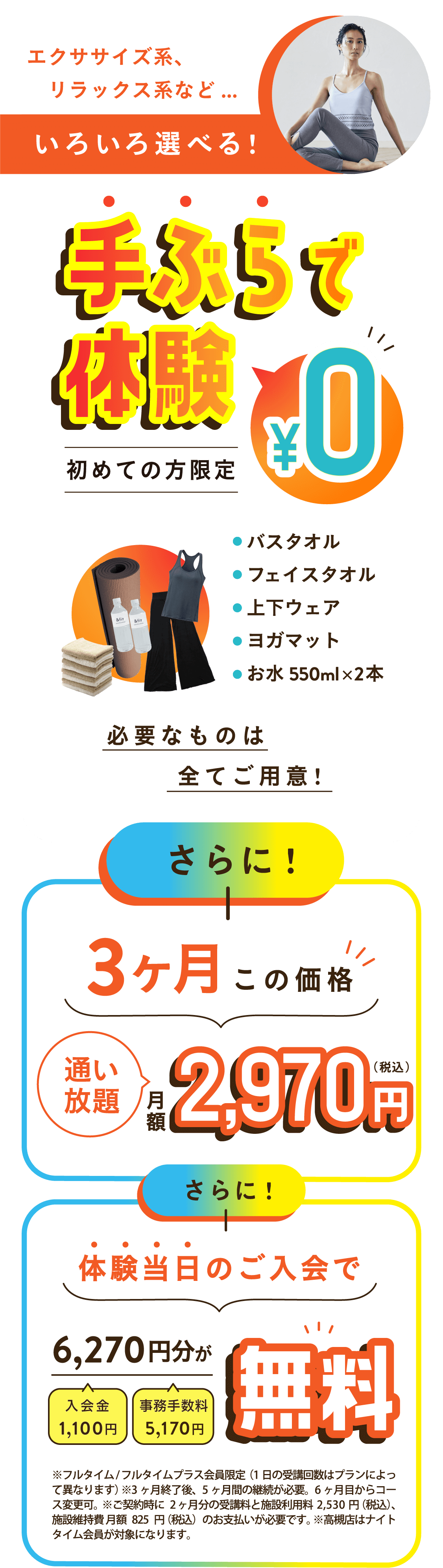 50分~60分のレッスンで、初回体験OKとなっているレッスンが受講いただけます。その他のレッスンは会員様限定となっておりますので予めご了承ください。