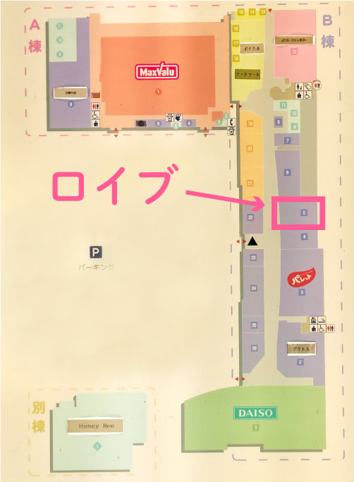 出口を出たら老健あかねを左手に水嶋南診療所を右手に250mほど直進します。用水路を渡って目の前に見えるのがイオンタウン水島でございます。そのまま駐車場を直進し、正面の入口より入館します。入館後目の前に見えるハニーズからすぐ左手に店舗がございます。