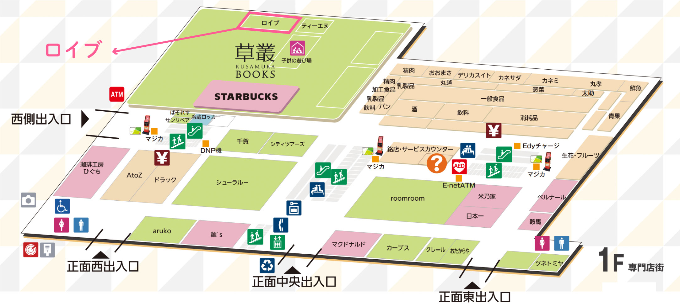 各務原駅前通りを600mほど直進します。交差点でDCMカーマが見えたら横断歩道を渡り左に曲がります。150mほど進むと右手に駐車場入口がございますのでそこからアピタ敷地内に入り駐車場を直進します。しばらくすると左手にアピタ西口がございますので、そちらから入館ください。入館後すぐ左手に草叢BOOKSがございますので入店し直進すると、一番奥に店舗がございます。
