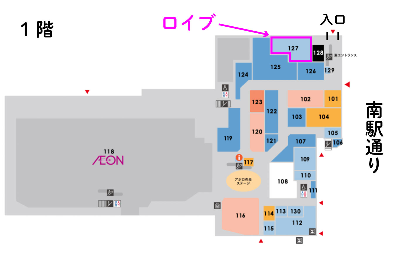 南駅通りのバスターミナル1番のり場すぐの入口(角を曲がったところにあります)から入館。入ってすぐ右手にATMコーナーがあり、その隣に店舗がございます。