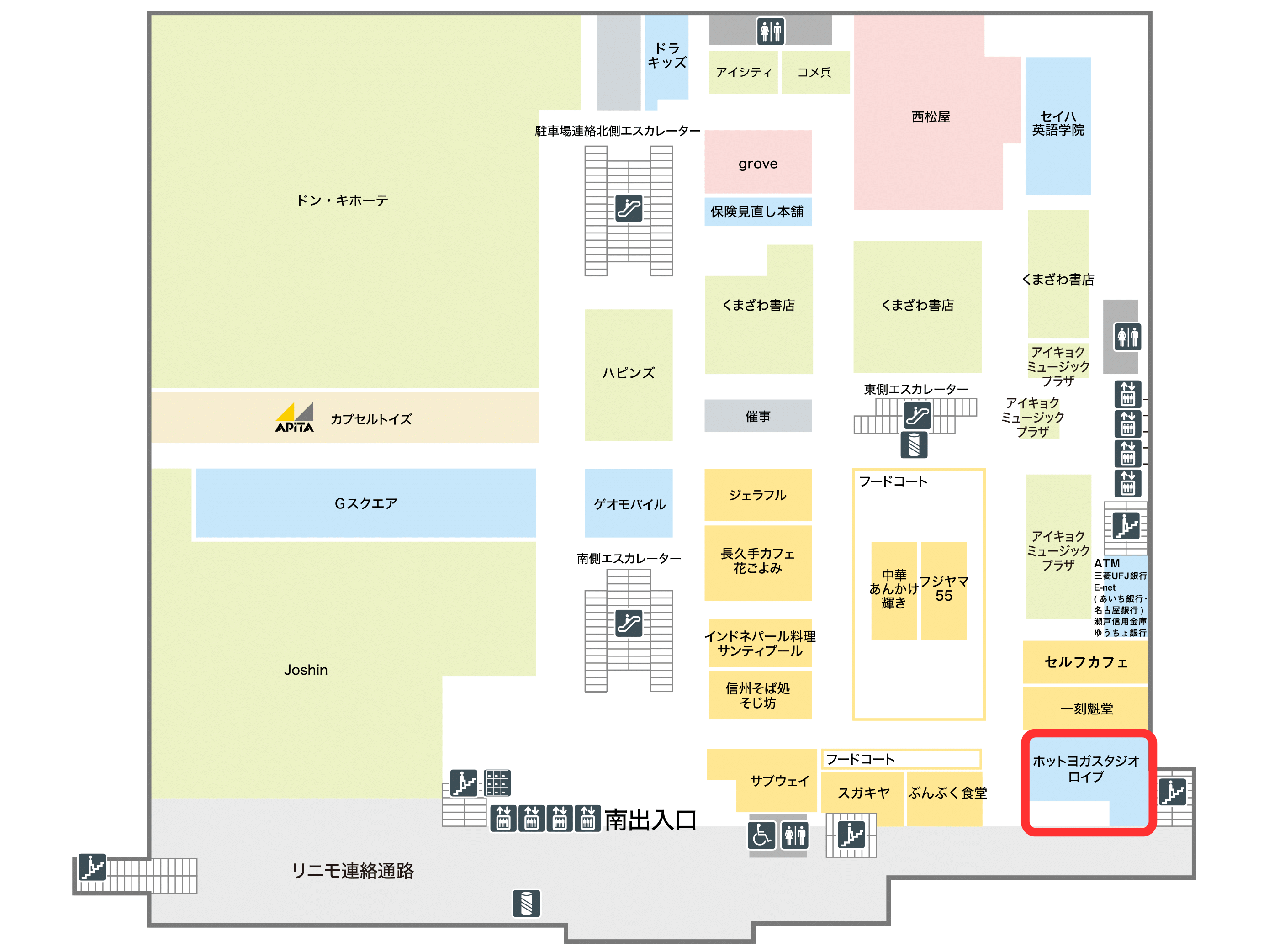 リニア連絡通路を通り、2階南出入口から入館。入館後右に曲がり、サブウェイを右手に直進すると突き当たりに店舗がございます。