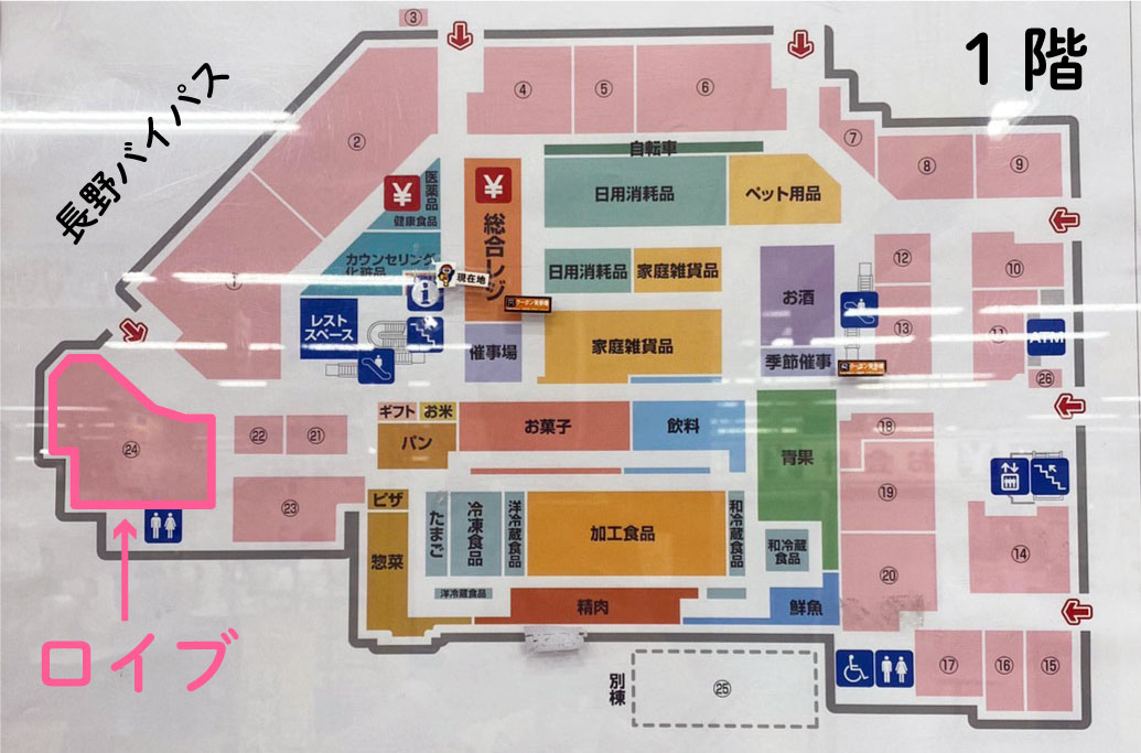 長野バイパス沿い北方面1階駐車場に停めていただき、宝くじ売り場横の入口より入館。右斜めに進むと、店舗がございます。
